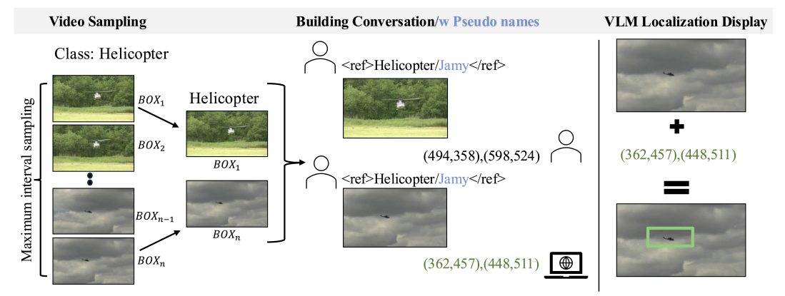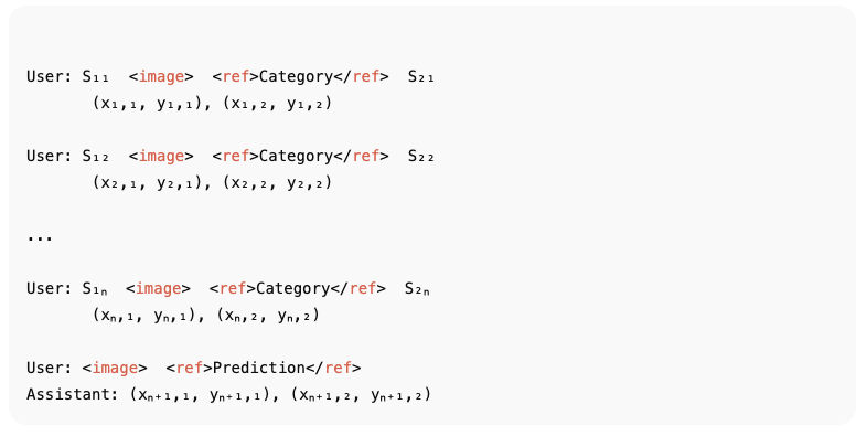 ๋ ฅ๋ฐ์ ๋ค, ๋ง์ง๋ง ๋จ๊ณ์ 'Prediction' ์์ฒญ์ ๋ํด ๋์ผํ ๊ฐ์ฒด์ ์์น๋ฅผ ์์ธกํ๋ ๊ณผ์ ์ ๋ณด์ฌ์ค๋๋ค. ์ฌ์ฉ์๋ ์์ n๊ฐ์ ์์ ์ด๋ฏธ์ง์ ํด๋น ๊ฐ์ฒด์ ์ขํ๋ฅผ ์ ๊ณตํ๊ณ , ๋ง์ง๋ง์ "์ด ์ด๋ฏธ์ง์์ ๊ฐ์ ๊ฐ์ฒด๋ฅผ ์ฐพ์๋ณด๋ผ"๊ณ ์์ฒญํฉ๋๋ค. ๋ชจ๋ธ(Assistant)์ ์ง๊ธ๊น์ง ์ ๊ณต๋ฐ์ ์ ๋ณด๋ฅผ ๋ฌธ๋งฅ์ผ๋ก ํ์ฉํด ์์ธก๋ ๋ฐ์ด๋ฉ ๋ฐ์ค ์ขํ๋ฅผ ์ถ๋ ฅํ๊ฒ ๋์ง์. ๊ฒฐ๊ตญ ๋ชจ๋ธ์ ์์ ๋ณธ ์์๋ค์ ์ผ์ข