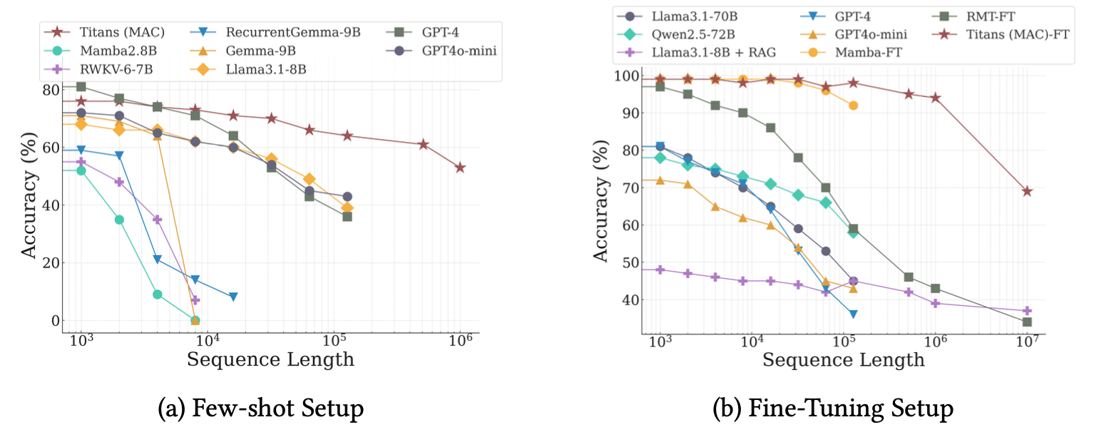 ์คํธ ๊ฒฐ๊ณผ. ๋ฌธ๋งฅ์ด ๊ธธ์ด์ง์๋ก(๊ฐ๋ก์ถ) ๋ค๋ฅธ ๋ชจ๋ธ๋ค์ ์ฑ๋ฅ์ ๊ธ๋ฝํ์ง๋ง, Titans(MAC)๋ ์์ ์ ์ธ ์ ํ๋๋ฅผ ์ ์งํ๋ค. ์ถ์ฒ: ๊ตฌ๊ธ.