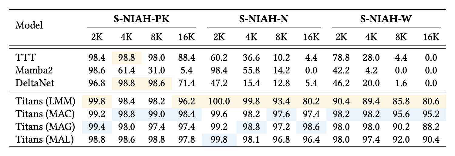 ๋๋ค. ์ด๋ Titans์ ์์ํ ๋ฉ๋ชจ๋ฆฌ ์ฑ๋ฅ์ ์ฆ๋ช