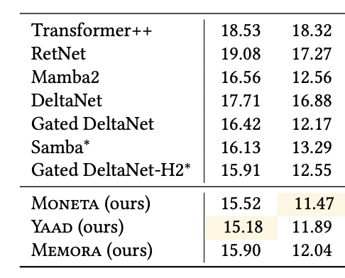 Transformer++๋ 18.53, ๊ธฐ์กด ํ์ค ๋ชจ๋ธ์ธ Mamba2๋ 16.56์ ๊ธฐ๋กํ ๋ ์ฐ๊ตฌ์ง์ YAAD๋ 15.18์ ๊ธฐ๋กํ์ต๋๋ค. ์์น์, YAAD๊ฐ ํจ์ฌ ์ ์ ๋ฉ๋ชจ๋ฆฌ ์ฉ๋์ ์ฌ์ฉํ๋ฉด์๋ Transformer++๋ณด๋ค ๋ ๋๋ํ๊ฒ ์ธ์ด๋ฅผ ์ดํดํ๋ค๋ ๊ฒ์ ์๋ฏธํ์ง์.๐ค