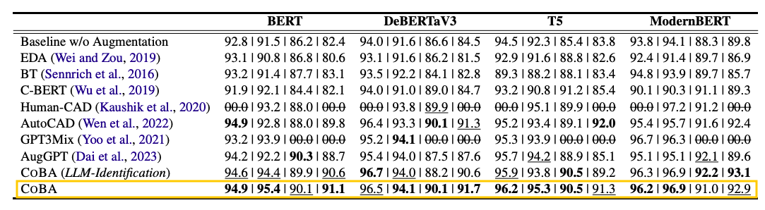 ํํ ๋๋ฌ๋๋๋ฐ์. COBA๋ SST-2, IMDB, SNLI ๋ฑ ์ฃผ์ ๋ฒค์น๋งํฌ์์ AutoCAD, AugGPT ๋ฑ ์ต์ ์ฆ๊ฐ ๊ธฐ๋ฒ์ ์ํํ๋ ์ฑ๋ฅ์ ๊ธฐ๋กํ์ต๋๋ค. |
